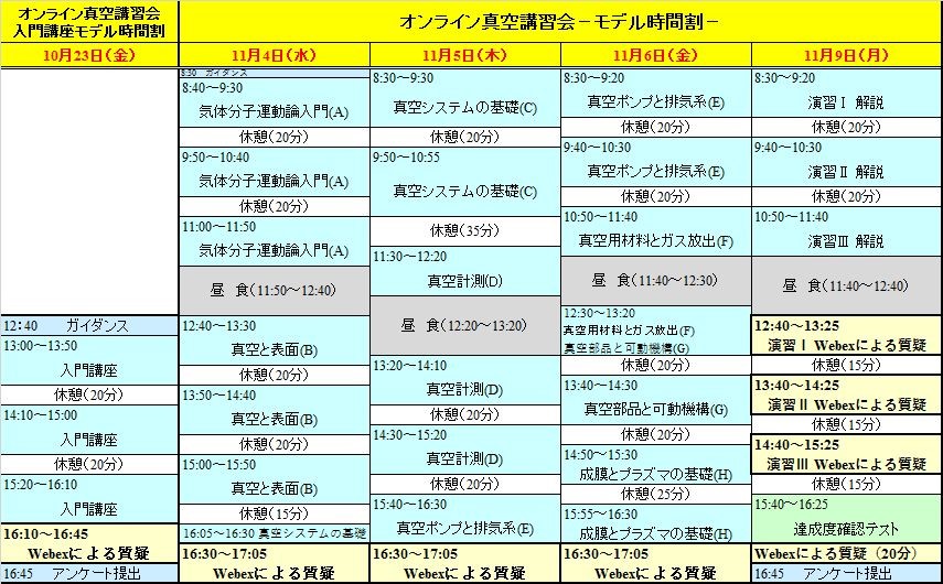 ※モデル時間割は変更になる場合があります。また、オンライン真空講習会入門講座は別途申し込みが必要です。
